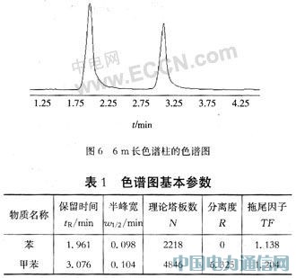 式中:tR是保留时间;ω1/2是半峰宽。从图中可以计算得出苯的理论塔板数2218,甲苯的理论塔板数4846。