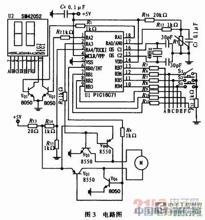 图3是控制阀的电路图。系统使用低压直流电源,用PIC16C71单片机做控制,通过程序控制实现各项功能。