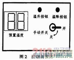 设计控制面板按钮应最少化,并且使用方便,功能合理,控制操作简便,仪表能显示出设置的温度。控制面板如图2所示,面板左侧的2位LED数码管用来显示预置的用水温度。面板右上方的温升按键、温降按键分别用来增加和减少预置出来水温的温度。面板右下方为手动开关,决定水阀的开关和出水量大小,当其置于“关”时,为关闭出水非工作状态。