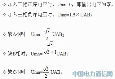 根据上述向量图,分析发生各类电压接线异常情况时的mn间的电压幅值,可得出以下结论: