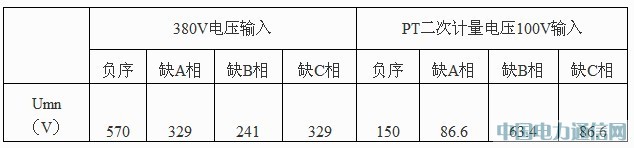 从表中可发现,380V电压回路发生反相序接线时,Umn输出电压量最大;PT二次计量电压回路发生B相缺相时,Umn输出电压最小。