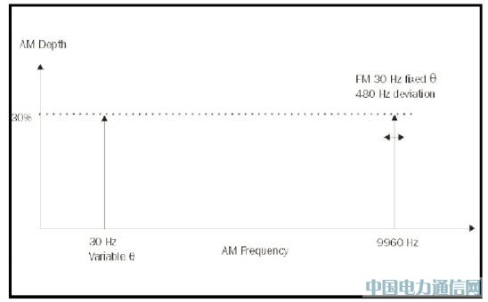 VOR 用于飞机的飞行导航;它指示发送给或来自位于地面上的固定信标(其发射一个VHF复合信号)的方位。在相同载波频率下,产生频率为 9.96 kHz 的第二个AM音频,在30 Hz 速度下进行频率调制,偏差为±480 Hz。对9.96 kHz 子载波上的30 Hz AM 音频和30 Hz FM 音频的相位进行比较,得出来自信标的飞机方位信息。图 5 显示了一个VOR 信号的调制频谱。