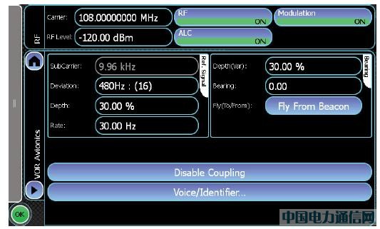 使用 ID 摩尔斯电码和/或声音音频来产生 VOR 信号需要SGA的全部四个调制振荡器,外加一个额外的非标配振荡器。振荡器 1 提供针对方位信号的30 Hz 音频。振荡器 2 提供9.96 KHz 子载波,这是由振荡器 5 调制的频率,用来以30 Hz 速度提供480 Hz 频率偏差。振荡器 3 和 4 提供 ID 和声音音频,像在 ILS 模式下一样。图 6 显示了SGA上的VOR 应用屏幕。