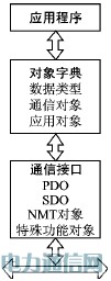 一个CANopen设备模块可分为3部分,如图1所示。通信接口和协议软件用于提供在总线上收发通信对象的服务;不同CANopen设备间的通信都是通过交换通信对象来完成的, 这一部分直接面向CAN控制器进行操作。对象字典描述了设备使用的所有数据类型、通信对象和应用对象;对象字典位于通信程序和应用程序之间,用于向应用程序提供接口。应用程序对对象字典进行操作,即可实现CANopen通信。它包括功能部分和通信部分,通信部分通过对对象字典进行操作实现CANopen通信;而功能部分则根据应用要求来实现。