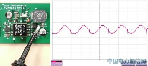 此外,把把示波器引线绕在铁芯上可减小这个电流,因为这样会形成一个不影响差分电压测量、但可降低由共模电流产生的测量误差的共模电感。图2显示了采用改进测量技术对同一电路得到的纹波电压测量结果。可以看到,高频尖刺已几乎消除。