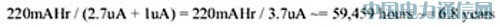 图 1 显示的详细系统工作时平均电流消耗略低于 4uA。总系统电流由以下因素构成:持续激励与每个传感器的测量,每次全程转动后 CPU 唤醒进行数据处理,以及基于静态图块 (segment) 的 LCD 显示器。当采用典型的 220mAHr 3V CR2032 等电池供电的解决方案时,类似所描述系统的使用寿命可超过 5 年,计算如下: