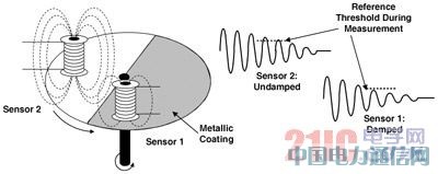 如图 2 所示,传感器 1 受到转动轮金属涂层部分的影响。与未受影响的传感器 2 的信号输出相比,振荡衰减率增加。由磁场切割在金属表面形成的感应涡流增加了 LC 传感器的负载,从而加快了激励振荡的存储能量的消耗。增加的衰减率也可称为金属表面产生的传感器衰减。如能够顺利地检测到与对应未衰减条件相应的衰减信号,则可检测精心设计转动轮的系统就提供一种感应给定系统运动的方法。