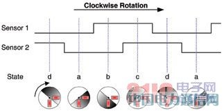对于图 1 显示的详细系统,我们采用双传感器设置,从而既能检测转动、又能检测方向。如果我们如图 2 所示相隔 90 度放置传感器,并采用 180 度的金属涂层轮,双 LC 传感器就会产生正交信号,这就能提供转动与方向编码信号。图 3 显示了随着轮转动的传感器变化情况以及相应的数字译码。