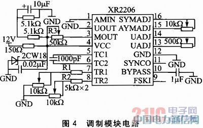 通过对信道特性测试发现,在四级钻杆级联(共40m)、耦合线圈的匝数为400匝(耦合线圈采用的铜丝半径0.2mm)的情况下,当输入120 kHz的正弦波时输出信号的幅度最大,说明由感应线圈构成的信道的谐振频率是120 kHz,载波频率可以选在120 kHz附近,因此采用价格低廉、满足要求的XR2206作为调制芯片,与其配对的XR2211作为解调芯片。