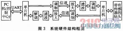 系统的硬件结构框图如图3所示。整个系统以两片单片机为核心,以XR2206和XR2211为调制解调芯片,以MAX275为带通滤波器芯片,放大电路采用基本的共射极放大电路。系统可实现双向通信(不是全双工,只能工作在半双工方式下,即信道可以分时复用),地面主要向下传输控制信号,井下向上传输温度、压力等信息,上下具有对称结构,因此在后面的分析中只分析单向信号传输的模块即可。当然在实际的钻井作业中,有的井深达千米,需要多级钻杆级联,所以每过3到5级钻杆后需要对信号进行解调放大调制,实际上就是需要一个中继模块,该中继模块完成解调放大再调制的功能。