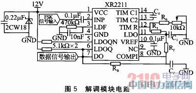 根据XR2211芯片手册,按照其步骤计算出相关参数。中心频率,R0的推荐范围是10~100 kΩ,这里选取R0=16.67 kΩ,则C0=1/f0R0=500 pF,R1=2R0·f0/(f2-f1)=200 kΩ,C1=1 250×C0/R10.52=12 pF;Rf≥5R1,取Rf=1 MΩ,RB≥5Rf,取RB=5 MΩ,Rsum=(Rf+R1)RB/(Rf+R1+RB)=967 kΩ;Cf=0.25/(Rsum×波特率),当波特率是9 600 b/s时,Cf=27 pF。波特率是其他数值的时候相应的改变Cf的值即可。以上计算得到的数值如果不是标称值的电阻或者电容,可以采用串联或者并联的方式构成所需的电阻或者电容。