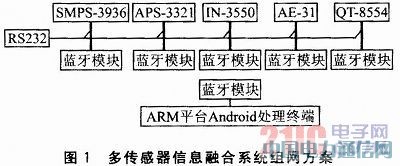 5种测量仪器均支持RS232的接口通信标准,分别通过RS232连接蓝牙模块,ARM端信息融合应用系统通过蓝牙接收并存储这5种仪器采集的数据。在一个蓝牙微微网中主节点最多可以有7个从节点,并且允许多至256个从节点与主节点保持在休眠状态。蓝牙的发射距离一般为10 m,通过增大发射功率可达100 m。组网方案中采用蓝牙进行组网,完全可以满足短距离无线通信的需要。结合实际情况,整个系统的组网方案设计如图1所示。