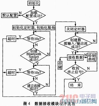 数据接收模块主要实现多传感器数据的接收、数据曲线的绘制和存储。通过继承Android平台下的Service类,建立5个仪器可以同时后台执行的数据采集服务;配合Notification的便捷操作,实现不同仪器数据采集界面的切换。数据接收模块程序流程如图4所示。