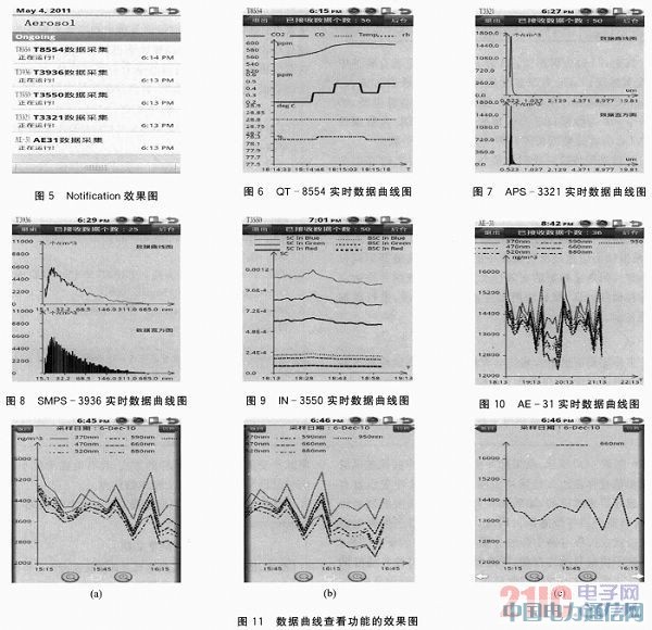 仪器端蓝牙同ARM端蓝牙建立连接后开始数据传输,信息融合系统开始采集并存储数据,同时绘制数据曲线。图5为5种仪器同时在后台运行的Notification效果图。图6~图10分别为QT-8554、APS-3321、SMPS-3936、IN-3550、AE-31的实时数据曲线图。