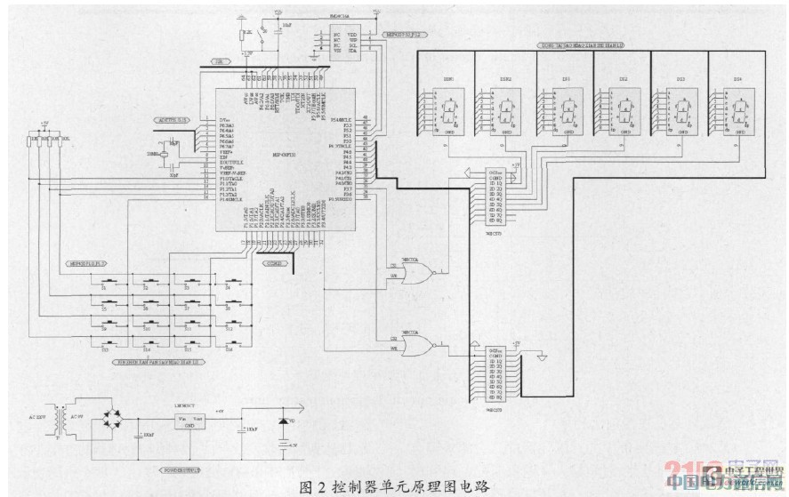 系统供电采用LM7805整流后的+3.3V直流电源,以+4.5V电池组作为后备电源;系统采用4×4矩阵键盘进行参数设置;外扩了FM24C16以增加系统数据储能力;用户的用电量显示可精确到最新10m内的用电量,采用6只共阴极LED数码管构成的动态扫描显示电路第一位采用16进制数字表示16个用户,其后的5位数字显示相应用户的当前用电量,精度可以精确到小数点后2位数。也可以将其用电量数据经单片机处理后直接循环逐次显示当前用电费用,采用不同时刻不同费率的计算处理手段同时可以实现计费复费率功能。其具体硬件原理连接电路图如图2所示。