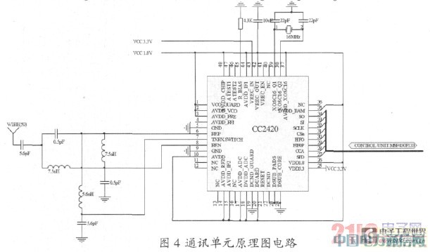 CC2420内部使用1.8V工作电压,因而功耗很低,适合于电池供电的设备;外部数字I/O接口使用3.3V电压,这样对于只有3.3V电源的设备,不需要额外的电压转换电路就能正常工作。CC2420射频信号的收发采用差分方式传送,其最佳差分负载是115+j180,阻抗匹配电路应该根据这个数值进行调整。如果使用单端天线则需要使用平衡/非平衡转换电路,以达到最佳收发效果。CC2420与处理器的连接非常方便。它使用SDF、FIFO、FIFOP、和CCA四个引脚表示收发数据的状态;而处理器通过SPI接口与CC242O交换数据、发送命令等;CC2420通过4线SPI总线(SI、SO、SCLK、CSn)设置芯片的工作模式并实现读/写缓存数据、读/写状态寄存器等。通过控制FIFO和FIFOP管脚接口的状态可设置发射/接收缓存器。