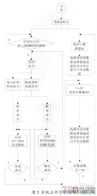 系统进程首先进行初始化,成功后的进程分为并列的两部分。其一是各户用电量的上抄:单片机内轮抄计数器置01,MSP430F133对74LS150的ABCD四个控制端置0000位,此时引脚EA0对应的通道接通到MSP430F133的输入端,单片机统计其在32s内积累的脉冲数。2s后,轮抄计数器加1为02,ABCD置1000位,EA1对应通道接通,进行相应用户的计数积累脉冲的上抄,以此循环进行相应用户的抄送,当轮抄计数器的数目=16时,完成总共16户的上抄,将轮抄计数器的置01,进行下一轮循环的上抄。总体上讲,整个电表系统32s为一个循环,对用户用电量进行循环抄送,每10m将各用户累加器单元统计的累积脉冲计算转换为电量数据(用电量=脉冲数×16×仪表脉冲/功率输出常数,因统计脉冲数是真实值的1/16)并附属时间常数存储到对应的存储器单元,并且实时显示最新10m内的用电量/用电费用,每1h末进行用电数据(用电量和对应的时间常数)的定时传送,其二是电表数据的上传和断电的执行:启动CC2420连入ZigBee局域网,成功后等待上层集中器命令,一旦网络断开立即重启CC2420重新连入局域网络;上层集中器下载的命令分为数据上传和欠费断电两种,若是断电命令,MSP430F133控制相应用户的SSR断开电源连接,成功后自动转为待命状态,若不成功,重复进行断电操作直至操作成功。若是上传命令,MSP430F133立即将累加器内积累脉冲转化为电量数据附上时间常数存储到对应的存储器单元,然后将前1h末到此刻RAM内的存储数据通过CC2420以ZigBee通讯的方式上传到上位集中器。成功后自动转入待命状态。