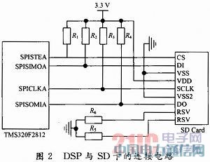 SD卡与DSP的4个I/O口相连。SD卡的CS管脚连接到DSP的SPISTEA管脚,用作普通I/O功能,其高低电平控制SD卡的使能与否;DI管脚连接到SPISIMOA管脚,DSP通过这个管脚向SD卡发送数据和命令;DO管脚连接到SPISOMIA管脚,DSP通过这个管脚读取SD卡内的数据;SCLK管脚连接到SPICLKA管脚,DSP通过这个管脚向SD卡发送时钟信号。具体连接电路如图2所示。