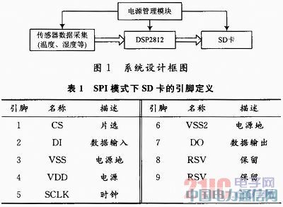 根据SD卡的通信协议,主控制器和SD卡有两种通信模式:SD模式和SPI模式。前者速度快(4位并行数据总线),使用所有的信号线;后者速度慢(数据以单线传输),但是简单易用、兼容性好、便于和主控制器连接通信。SPI模式的传输速度可以满足本文设计的系统要求,因此,本设计采用SPI模式。表1是SD卡在SPI模式下的各引脚定义。