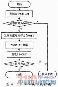 SD卡支持单块写操作(CMD24)和多块写操作(CMD25)。图4为单块写操作流程图,数据长度为512 B。执行单块写操作时,主机发送写数据块命令(CMD24),等待SD卡的应答信号为00H后,然后发送数据起始标志位0xFE,接着发送512 B数据和2 B的(2RC校验。当SD卡的应答信号为0x05时,即表明SD卡已经正确地写入了数据。在写SD卡时,SD卡的输出口为低电平,当输出口变为高电平时表明写操作完成。