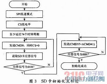 对SD卡进行读写操作之前,首先应该初始化SD卡。SD卡初始化流程如图3所示。为了保持SD卡的兼容性,设置SPI的时钟频率在100~400 kHz范围内。SD卡上电后,主机必须先向SD卡发送至少74个时钟周期,同时CS处于低电平,以完成SD卡上电过程。SD卡上电后默认进入SD模式,在此模式下向SD卡发送复位命令(CMD0)并保持CS为低电平,如果收到应答信号为01H,则SD卡进入SPI模式。