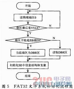 初始化流程如图5所示。首先读卡的物理扇区0,得到引导扇区的偏移地址。正常的话,该扇区最后两个字节为55AA。然后读引导扇区DBR的具体内容,得到文件系统的基本信息,初始化SD卡的信息结构体变量。