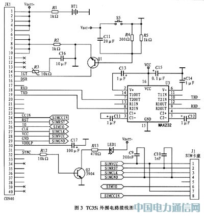 该模块集射频电路和基带于一体,向用户提供标准的AT命令接口,为数据、语音和短消息提供快速、可靠、安全的传输,方便用户的应用开发及设计。TC35i有40个引脚,通过ZIF连接器引出。这些引脚可划分为5类,即电源、数据输入/输出、SIM卡、音频接口和控制。TC35i外围电路图如图3所示。