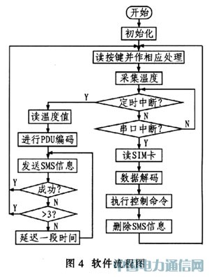 监测软件主要包括初始化程序、信号采集处理程序和短消息收发程序等。初始化程序包括硬件初始化、定时器和串口初始化:信号采集和处理主要完成外部采集的温度转换:接收短消息采用查询方式.一旦短消息到达,调用串口接收程序解码短消息内容并做出相应处理:发送温度信号采用定时方式,将采集的温度编码为短消息。然后调用发送指令将短消息发送到监测中心。