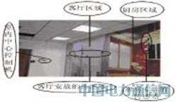系统测试的地点选择在按家居环境布局的展示厅。在展示厅的入门处安置一个室内中心控制机。将WIA-PA网关放置在门后的交换机箱内,按照房间(客厅、厨房)的布局,布置各传感器,在客厅中安放WIA-PA路由器及WIA-PA温、湿度传感器、WIA-PA烟雾传感器、WIA-PA一氧化碳传感器;在厨房中安放WIA-PA路由器、WIA-PA温、湿度传感器及WIA-PA甲烷传感器。系统测试环境图如图5所示。