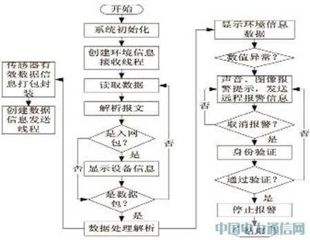系统初始化完成以后,室内中心控制机创建数据接收线程获取家居环境信息。传感器会发送两种数据包:一个是入网包,一个是数据包。收到入网包后,通过解析确定是哪个传感器上线,然后在室内中心机的相应界面上显示相应传感器的名称。收到数据包后,进行数据包的处理提出有效数据信息,计算出传感器的值,并在室内中心控制机上进行传感器数值的实时显示。同时将收到环境信息发送到远程监控中心,进行信息的及时更新和显示。当室内温度过高或者烟雾浓度、有害气的含量超标时,室内中心控制机将进行实时的本地报警同时将报警信息发送到远端监控主机上。室内中心控制机软件主流程图如图4所示。
