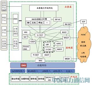 图1所示为IMS网络结构图,介绍了IMS网络中各网元的位置以及其它网元之间的交互,下面按照结构图对每个层面的主要功能实体进行简要的描述。
