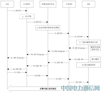 IMS多媒体彩振业务是主叫侧业务,主叫用户终端的INVITE经过主叫侧S-CSCF的IFC(Initial Filter Criteria)评估,触发到多媒体彩振服务器。多媒体彩振服务器根据用户的群组、时间条件设置,通过选铃音算法选择振铃文件,将音、视频文件的URL写入INVITE消息的Alert-Info,将文本、图片、电子名片按照规范编码写入MIME体中。INVITE消息送达被叫后,根据Alert-Info头下载和播放振铃文件,解析MIME中的媒体文件并在客户端呈现。被叫用户摘机后,终端停止播放和呈现振铃文件,并建立通话。具体流程图如图3所示。