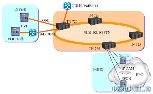 基于PTN的广电多业务城域网方案如图1所示。基于PTN的广电城域网的特点包括:一张网络提供所有业务;高达10G的分组承载技术,满足各种带宽需求;为双向改造提供了可靠的城域骨干;端到端的可靠QoS和流量管理;SDH级的50ms保护倒换;可以综合提供DTV,VOD,TSoC,Internet,数据专线业务,VoIP等业务。