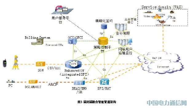 智能管道实现方案比较多,图3是一个典型的基于PCC架构的端到端融合智能管道解决方案。