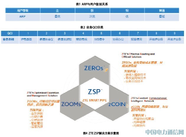 目前大部分运营商都在着力建设智能管道,各设备厂商也大都具有提供综合或者部分解决方案的能力。作为通信行业佼佼者的中兴,针对智能管道,提供名为ZSP(ZTE Smart Pipe)的综合解决方案(如图4所示),助力运营商打造端到端融合的“钻石级”智能管道。
