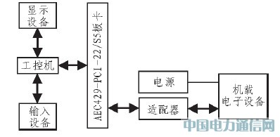将AEC429-PCI-22/S5接口卡的每个发送通道和接收通道分别作为总线数据仿真系统的的模拟输入及输出端口,也可直接与相应的检测设备相连进行总线数据通讯,按照ARINC429协议采用屏蔽双绞电缆,利用特定的适配器,实现对机载电子设备的指令数据的模拟输入及工作状态数据和故障信息的查询。由于不同的机载电子设备具有不同的通讯协议及硬件接口,故配合系统软件设计,系统还根据不同设备的特点,设计了特定的适配器,以满足多型设备总线数据发送、采集及故障诊断的需要。如图3所示。