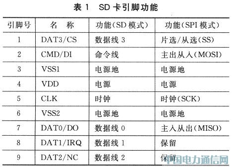 SD卡的外形如图1所示,引脚功能如表1所列。SD卡的引脚具有双重功能,既可工作在SD模式,也可工作在SPI模式。不同的模式下,引脚的功能不同。