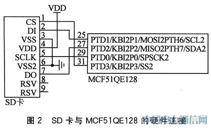 由于MCF51QE128是一款低功耗的微控制器,工作电压的典型值为3.6 V,与SD卡的工作电压兼容,因而可以直接与SD卡连接,无需电平转换电路。这里选用的是MCF51 QE128的第2个SPI口,硬件连接如图2所示。