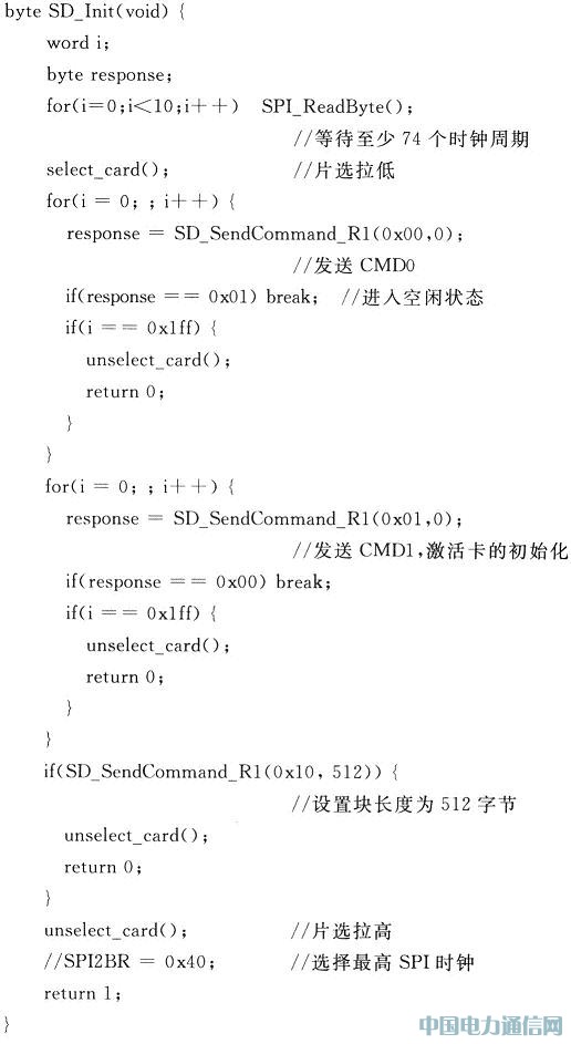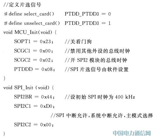 在与SD卡通信之前,首先需要配置MCF51QE128,并初始化SPI端口。代码如下: