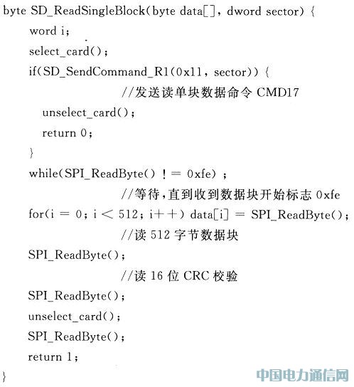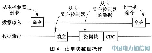 SPI模式支持单块和多块数据的读写操作,可通过发送相应的命令来实现。读单块数据的操作过程如图4所示。拉低片选后,首先由主控制器 MCF51QE128发送读单块数据命令CMD17,然后等待SD卡的响应。当收到数据块开始标志0xfe后,开始从SD卡读取512字节的数据,最后读取2字节的CRC校验位。