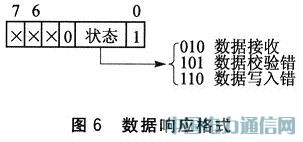 写入数据后,SD卡会发送1字节的数据响应来反馈数据写入的情况,其格式如图6所示。当数据正确写入SD卡后,数据响应为0x05。最后读数据总线,写数据忙时等待,直到总线为高电平。