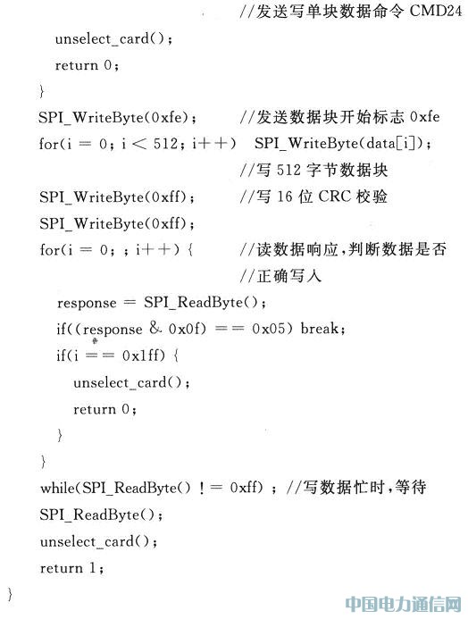 写单块数据的操作过程与读操作类似,如图5所示。拉低片选后同样由主控制器MCF51QE128发送写单块数据命令CMD24,SD卡正确响应后发送数据块开始标志0xfe,接着发送512字节数据块和2字节CRC校验。
