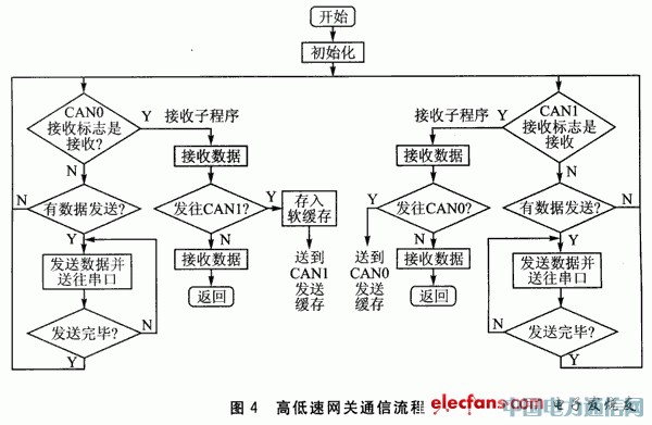 由于传输速率不同,高低速CAN网络之间的数据传输是不同的。当高速CAN网络数据向低速CAN传输时,生需要加入软缓存暂时存储;当低速CAN网络数据向高速CAN网路数传输时,可直接传输。通信流程如图4所示。