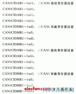 为了降低网络资源的占用率,提高网络通信实时性性能,在高低速CAN网络之间除了必要的通信外,各自的报文是相互独立传输的。这就需要使用CAN中的标识符通过验收过滤器进行报文过滤,可以通过对过滤器寄存器的设置实现这一功能。CANO与CAN4寄存器的验收寄存器与屏蔽寄存器的设置如下: