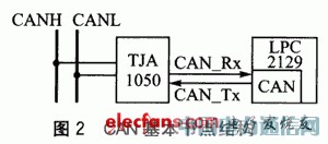 CAN节点硬件电路主要包括带有CAN控制器的微控制器和用于数据收发的CAN收发器。本设计使用的是NXP公司的32位微控制器LPC2129,它带有 CAN控制器,主要负责CAN的初始化和数据处理。CAN收发器种类有很多,本设计使用Philips公司的CAN高速收发器TJAl050。CAN基本节点结构如图2所示。