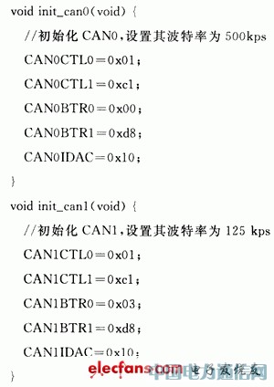 网关软件设计部分主要实现的功能是各节点的数据收发,特别是网关可以实现高低速网络数据的转换。对实时性要求不高的车灯控制和车窗控制电路采用低速CAN 网络,波特率为125 kbps;对实时性要求较高的ABS系统和EPS系统等采用高速CAN网络,波特率为500 kbps。