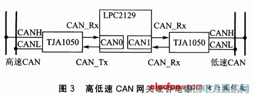 网关的主要作用是协调各网络之间数据的共享,负责各节点之间的通信。其硬件结构与CAN节点非常相似,由于它负责高速与低速网络之间的数据共享,所以必须同时跨接两个网络。CAN总线网关硬件结构如图3所示。