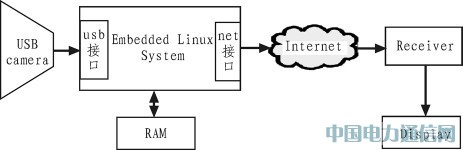 视频图像监控系统由4 部分组成, 分别为视频图像采集、视频图像处理、视频图像传输、视频图像显示。视频图像采集部分由数字摄像头、USB 通道和嵌入式处理器构成、视频图像处理主要是视频图像压缩,由算法实现、视频图像传输主要利用视频服务器来实现、视频图像显示主要是在远程的主机上实现视频图像的浏览、保存和处理等,Linux 主机上由应用程序实现,Windows 主机上通过浏览器上的JAVA 程序实现。系统原理框图如图1 所示。