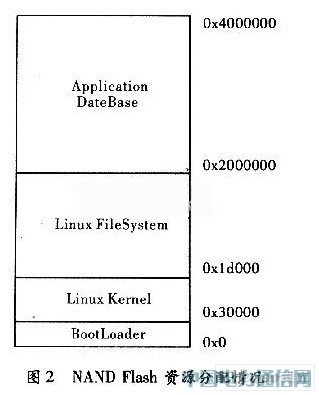 系统采用64 MB的SDRAM,由两片K4S561632芯片组成,工作在32位模式。另有64 MB的NANDFlash,采用K9F1208芯片。该芯片在系统中空间分配情况,如图2所示。