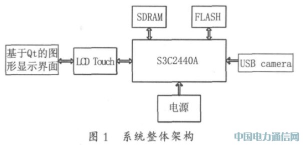 系统通过当前市场上应用最广泛的中芯微公司生产的zc301p 芯片的USB 摄像头进行图像采集,然后将图像信息传送到ARM 芯片中进行处理,最终通过基于Qt/Embedded 编写的图形显示程序在LCD 上实时显示。系统的整体架构如图1 所示。
